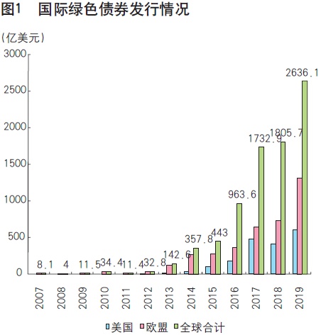 2006年,绿色债券开始在欧洲兴起。2007年,欧洲投资银行(EIB)发行了“气候意识债券”(Climate Awareness Bond),成为全球首只具有典型意义的绿色债券。2008年,世界银行与瑞典北欧斯安银行(SEB)联合发行了首只命名为“绿色债券”的债券。近年来,随着可持续发展理念深入人心并得益于税收优惠,绿色债券在欧美债务资本市场中得到广泛认可。2007年全球绿色债券发行额仅为8亿美元,2013年超过100亿美元,2017年“井喷”式增长至1732.9亿美元,2019年发行规模达2636.1亿美元。2020年上半年,受新冠肺炎疫情影响,全球绿色债券发行规模有所下降,合计发行941亿美元。