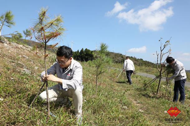 绿色生态的理念也早已植入每位宁波风电人的心中,他们曾利用节假日,上至公司领导,下至普通员工,几十个人从早干到晚。傍晚的山顶寒风凛冽,雨水和汗水浸透了所有人的衣衫,大家万众一心、众志成城,渴了就喝口自带的姜茶,饿了就拿块饼干填填肚子。两天后,2000颗湿地松组成了东海云顶的一抹“新绿”。