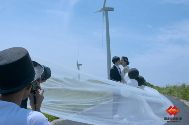 图为一对新人在美丽风电场为背景拍摄婚纱照