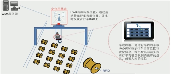 以前的电缆货场盘点时间长,准确度低,盘点效率低,通过对货场和行车上装配定位基站设备,行车移动是,行车内IPAD能动态显示货场货位位置,入库记位,卸货时系统记录放置货位。
