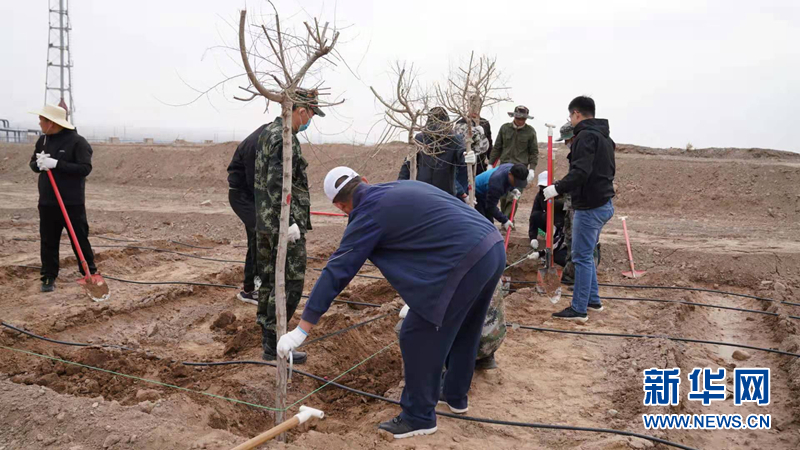4月8日,在甘肃省张掖市高台县一处义务植树造林点,干部群众正在植树。(高台县委宣传部供图)